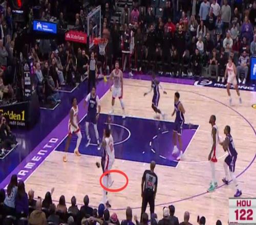 第三次也是漏判,发生在距离第四节结束还有28.4秒,杜兰特在创造空间时移动中枢脚,这是一次漏吹的走步违例,火箭获利,国王吃亏。