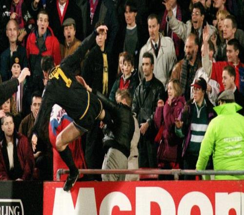当时,坎通纳被红牌罚下,水晶宫球迷马修·西蒙斯当众羞辱他,坎通纳飞身而起,越过广告牌一脚踹在西蒙斯胸口,因此被禁赛8个月,险些离开曼联。当时他穿着黑金配色的红魔客场战袍,给人留下深刻印象。